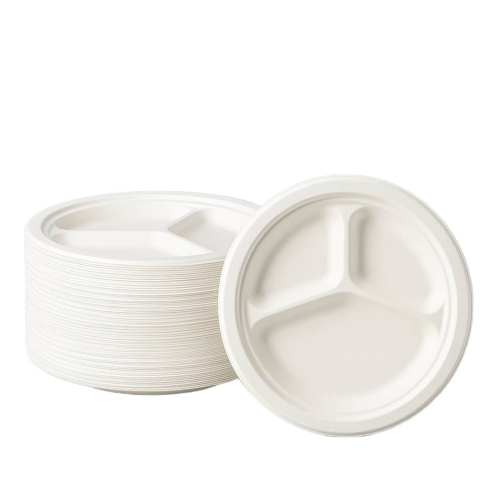 Ekologiczne talerze z trzciny cukrowej – 3-komorowe, 26 cm, 50 szt.